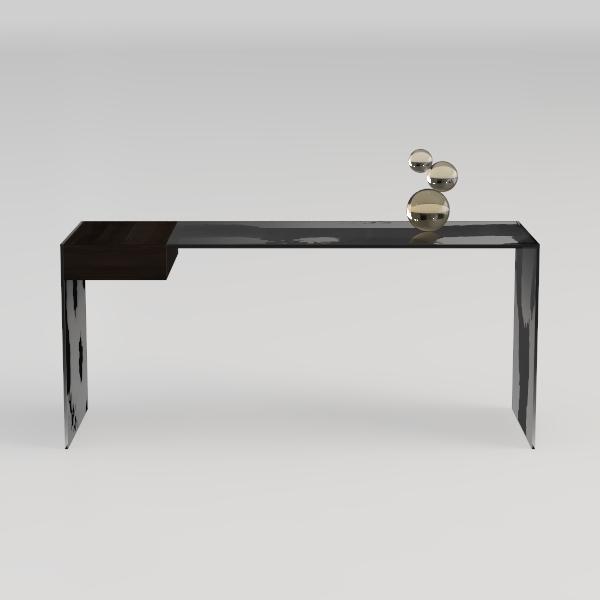 Visually, the composition is a study in modern sophistication: the matte-black tabletop, warm wood drawer, and polished metal legs create a harmonious trio, avoiding clutter to emphasize simplicity. This piece thrives in contemporary or minimalist-luxury settings, whether as a living room console, a home office desk, or a statement entryway table. It pairs beautifully with marble accents, sculptural metal orbs (as seen here), and potted greenery, softening its sleek edges with organic elements. Functionally, the integrated drawer offers practical storage for small essentials—stationery, remotes, or trinkets—while the generous surface area provides ample space for daily use, from working to displaying cherished objects. Its balanced proportions ensure it fits seamlessly into both compact and expansive rooms, making it a versatile, timeless addition to modern interiors.