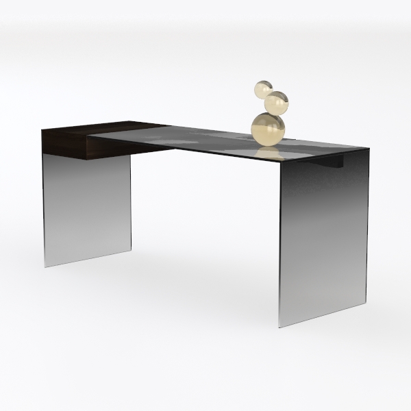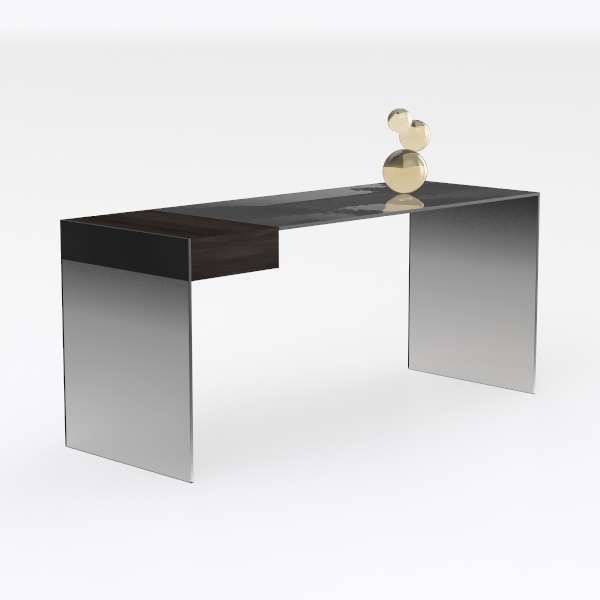 The design of this piece draws inspiration from the interplay of minimalist geometry and warm, organic textures, balancing sharp, clean lines with the tactile richness of natural materials. The expansive tabletop, rendered in a smooth, glossy black finish, exudes a cool, polished allure, its surface reflecting light to create a sense of spaciousness. Contrasting this, the integrated drawer features a deep, rich wood grain—warm and inviting to the touch, offering a textural counterpoint to the sleek black expanse above. The slender, metallic legs, with their high-shine, reflective surface, add a delicate yet sturdy presence, their thin profile allowing the piece to feel light and airy while providing unwavering stability.