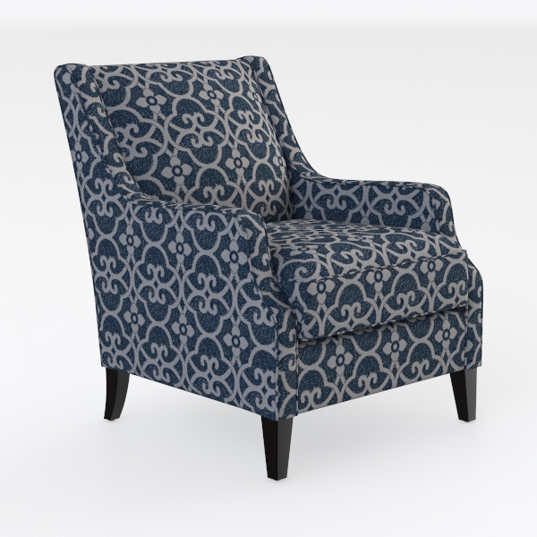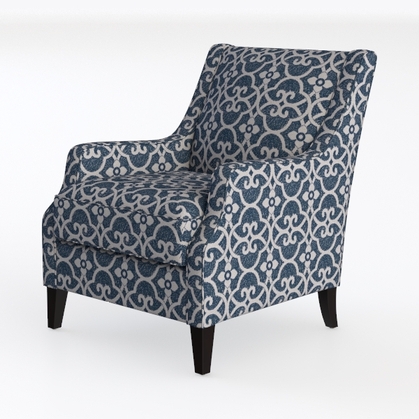 This elegant armchair draws inspiration from traditional geometric patterns, reminiscent of Moroccan or Middle Eastern design heritage. Its upholstery features a repeating, symmetrical motif in deep blue and soft gray, creating a timeless, intricate visual rhythm that adds depth without overwhelming the space. The fabric feels surprisingly plush to the touch, with a subtle texture that catches light gently, enhancing the chair’s sophisticated allure.
