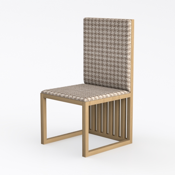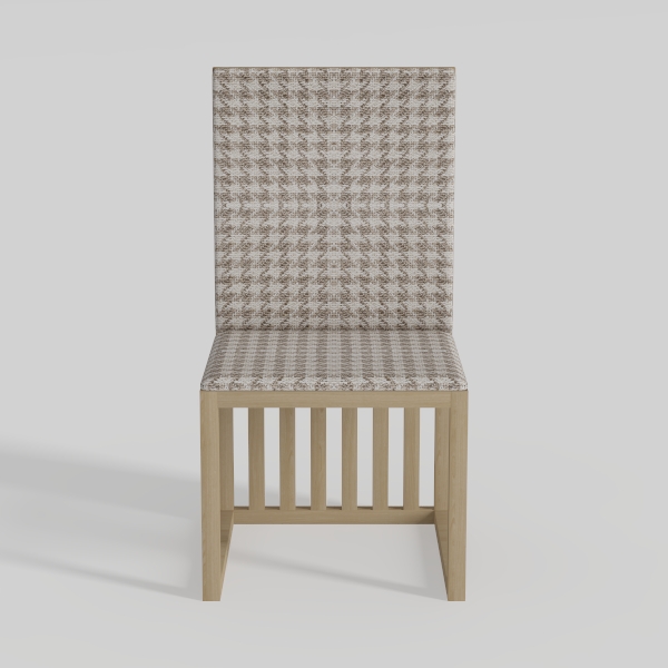 The design of this chair takes cues from the enduring allure of classic check patterns reimagined through a modern minimalist aesthetic. By merging soft beige and warm brown tones in its upholstery, it marries traditional charm with contemporary simplicity, creating a piece that feels both timeless and fresh. The fabric, with its subtle textured weave, is delightfully tactile—soft to the touch yet with enough structure to maintain its shape, flowing seamlessly from the backrest to the seat for a cohesive look. Complementing the upholstery, the frame is crafted from light wood, its natural grain and smooth finish adding a warm, organic contrast; the vertical slats of the backrest, paired with the slender, angled legs, infuse the design with a delicate yet sturdy presence, balancing visual lightness with lasting stability. Visually, the chair exudes a serene, airy quality, thanks to its neutral palette and uncluttered lines, which brighten any space. It shines in a modern dining room, where it pairs beautifully with a solid oak table and marble sideboard, or as a polished addition to a minimalist living room, harmonizing with a woven rug and a sleek coffee table. Functionally, the generous seat depth and contoured backrest offer exceptional comfort, supporting hours of relaxed sitting, while the light wood legs ensure steady, wobble-free use—every element, from the grid upholstery to the clean lines, comes together to make this chair both visually appealing and deeply practical.