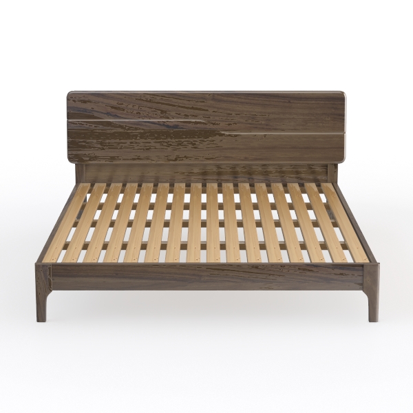 Rooted in a love for natural simplicity, this piece draws inspiration from the interplay of organic textures and minimalist design, evoking the calm of a sunlit forest and the clean lines of modern Scandinavian spaces. The headboard, crafted from a rich, dark-stained wood, reveals the tree’s inherent grain—deep, earthy patterns that catch light softly, while its smooth, slightly curved surface feels warm and inviting to the touch. Below, the slatted bed base, in a lighter, honeyed wood, adds a textural contrast: thin, evenly spaced slats that create a sense of airiness, their natural warmth balancing the headboard’s depth.