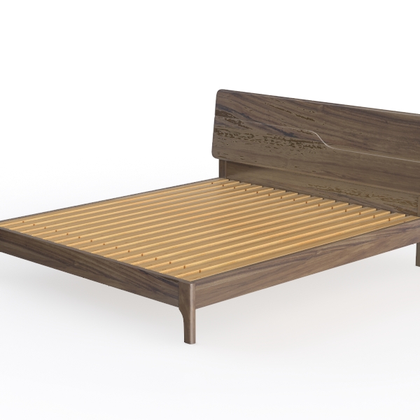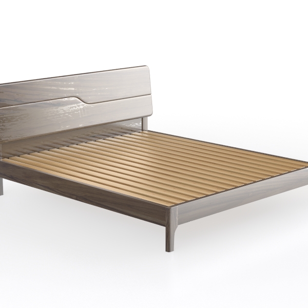 Visually, the piece feels grounded yet open, with the two wood tones harmonizing to cast gentle shadows that enhance its sculptural silhouette, making it a quiet centerpiece in any bedroom. It thrives in spaces embracing日式侘寂 (wabi-sabi) or modern minimalism, pairing effortlessly with linen bedding in soft beige, a woven jute rug, and a low wooden nightstand with a ceramic lamp. The low-profile frame, with tapering legs that lift it slightly from the floor, creates an illusion of spaciousness, ideal for smaller rooms, while the slatted base ensures breathability, keeping the mattress cool and supported.