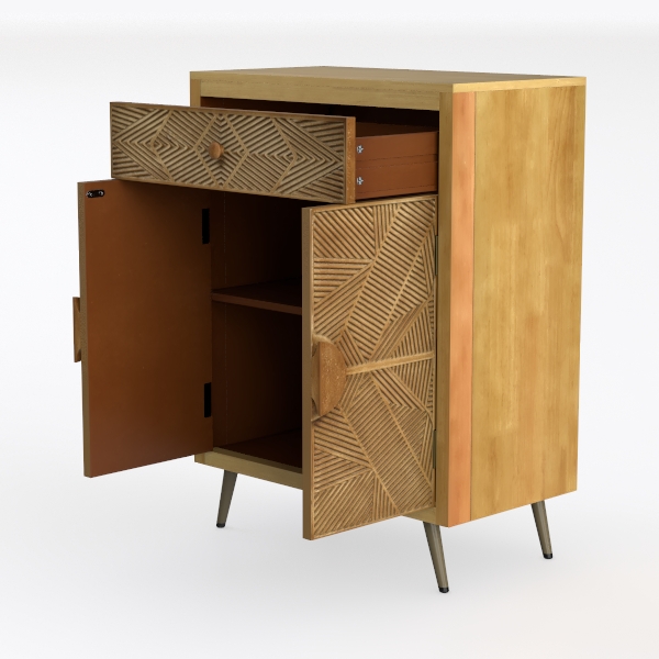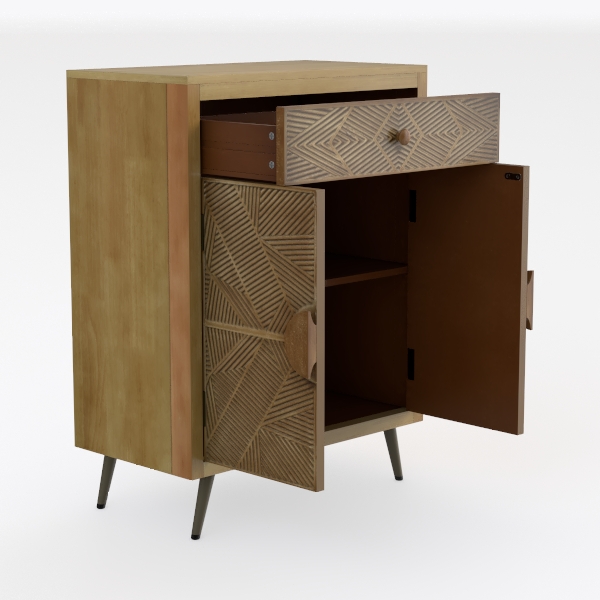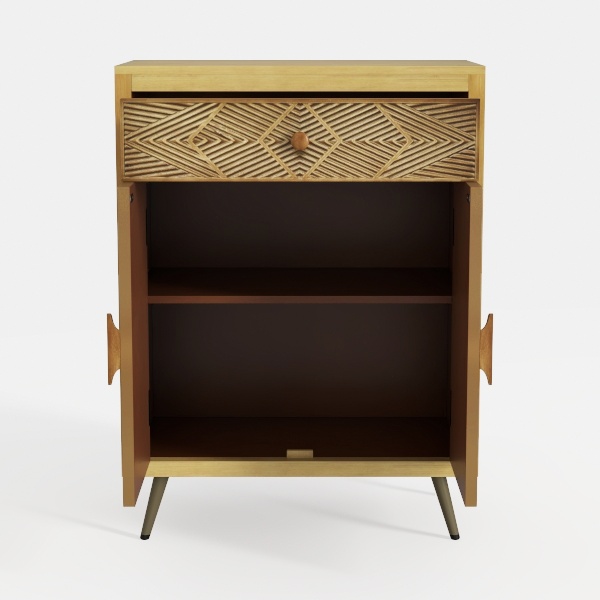 This piece draws inspiration from mid-century modern design principles, merging organic geometric motifs with warm, natural materials. Crafted from smooth, honey-tone wood, its frame exudes a soft, inviting warmth, with a subtle matte finish that feels gentle to the touch. The centerpiece is the drawer front, adorned with intricate interlocking diamond patterns—reminiscent of handwoven textiles—adding textural contrast that catches light softly, while the rounded wooden knob, with its smooth grain, offers a satisfying tactile anchor.