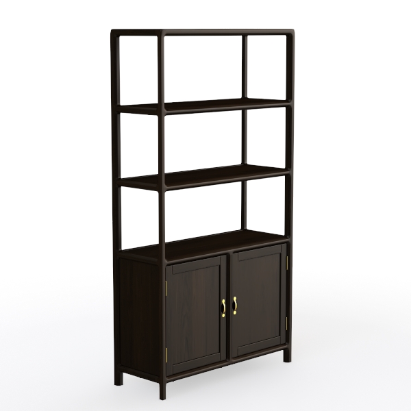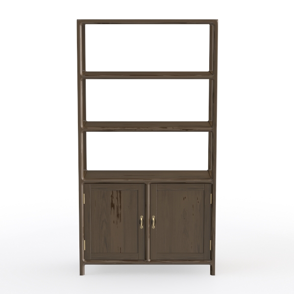 This versatile piece thrives in spaces seeking balance—ideal for a cozy home office, a sleek living room, or a serene bedroom. It pairs beautifully with soft textiles like linen throw pillows, ceramic vases, and matte black metal accents, enhancing its understated elegance. Above, three generous open shelves offer ample room to display favorite books, potted plants, or decorative objects, while the two closed cabinets below provide discreet storage for smaller items, keeping the area organized. Sturdy wooden legs and delicate brass handles add a final touch of refinement, making it not just a functional storage solution but a decorative focal point that elevates any interior.
