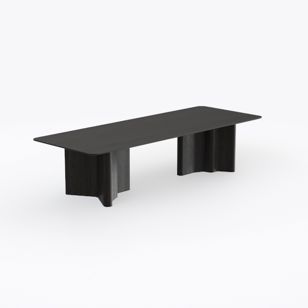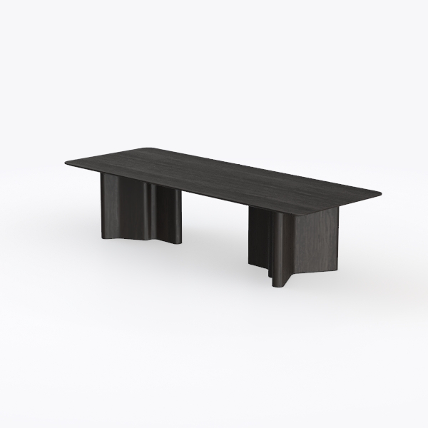 The tabletop, a smooth, matte slab of sustainably harvested oak, features a warm, honeyed tone with subtle, natural grain patterns that catch light gently, creating depth without overwhelming the eye. Below, the supporting bases emerge as sculptural, wave-like forms, cast from a composite material with a rich, charcoal finish. Their textured surface mimics the ruggedness of stone, while the way they curve inward and outward adds a sense of movement, making the table feel both grounded and ethereal.