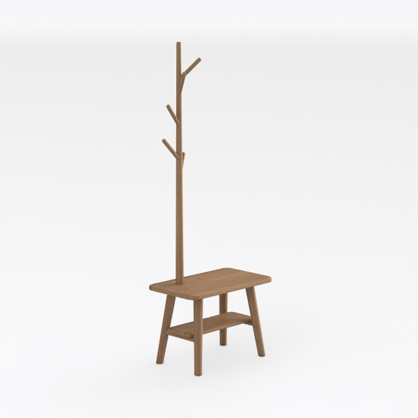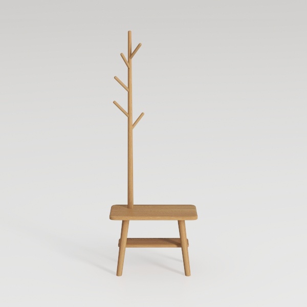 This piece merges organic charm with everyday utility, taking cues from the quiet elegance of natural landscapes. The core structure is a compact, low wooden bench with a gently rounded seat—its surface smooth and warm, revealing subtle, soft wood grain that feels like a snippet of a sun-dappled forest floor. From one edge of the bench rises a cluster of slender, branching hooks, each curved and spaced to mimic the gnarled limbs of a young tree, their light, open design avoiding clutter. The overall aesthetic is understated yet inviting, with clean, unadorned lines and a soft, honeyed hue that complements both minimalist and cozy settings.