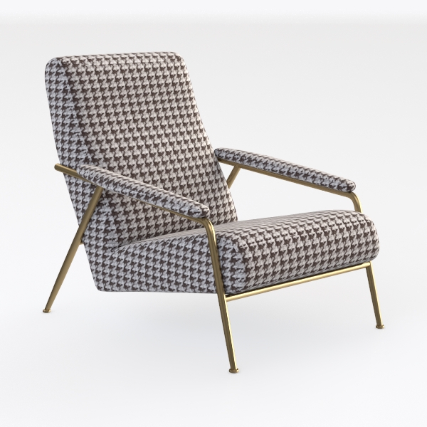 The upholstery, a timeless houndstooth pattern in warm brown and soft cream, feels surprisingly plush to the touch—woven from a smooth yet textured fabric that invites lingering. The high, gently sloped back and wide, padded arms cradle the body, offering excellent lumbar support and a cozy spot for resting arms. Below, a slim, polished brass frame grounds the piece, its matte finish adding subtle warmth that contrasts beautifully with the fabric’s crisp pattern, creating a visually light yet stable silhouette.