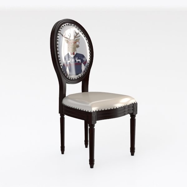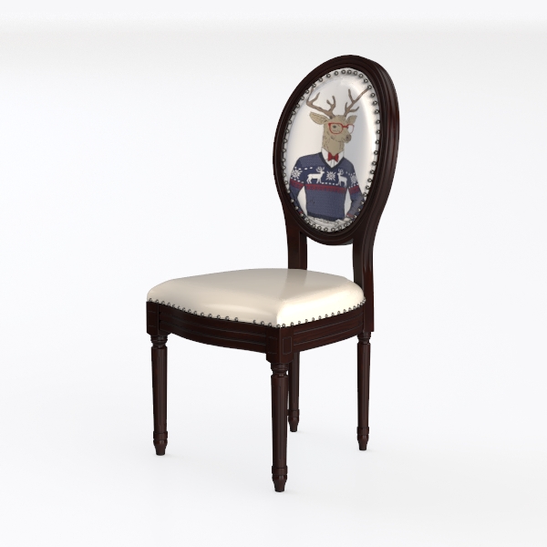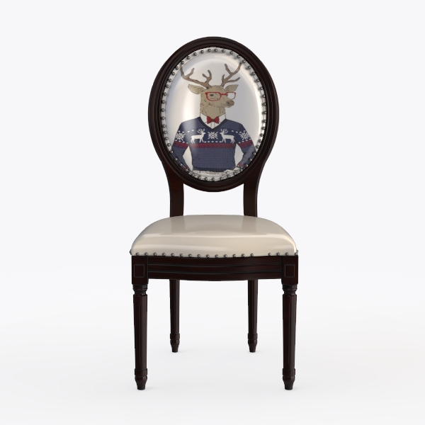 This charming chair draws inspiration from a playful blend of nature-inspired art and mid-century modern design, merging whimsy with timeless elegance. Crafted with a rich, dark wooden frame, its smooth, polished surface catches light softly, exuding warmth and stability. The star feature is the curved oval backrest, adorned with a detailed illustration of a deer in a cozy, patterned sweater—complete with round red glasses and a dapper bow tie—adding a touch of personality and artistic flair.