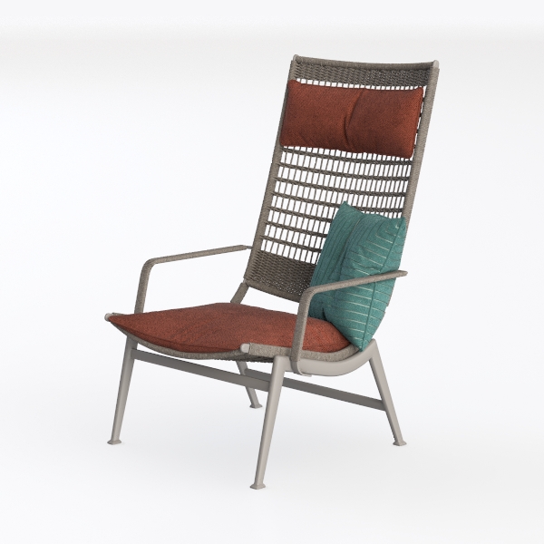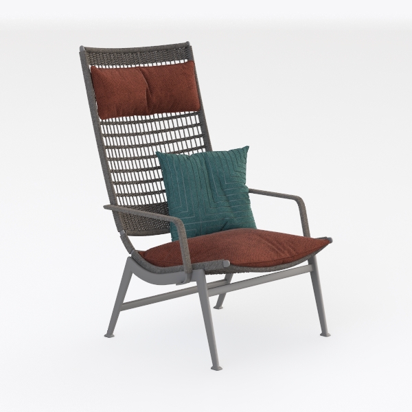 This sophisticated chair merges modern minimalism with organic charm, drawing inspiration from the rhythmic interplay of natural weaving patterns. Its frame, crafted from matte metal, provides a sleek, steady base, while the interwoven back and armrests feature a light, airy texture—delicate yet robust, catching light to avoid heaviness. The plush, rust-red cushions invite immediate comfort, their soft fabric offering a warm contrast to the cool metal, while a vibrant teal throw pillow with subtle geometric stripes adds a lively pop of color, balancing the palette.