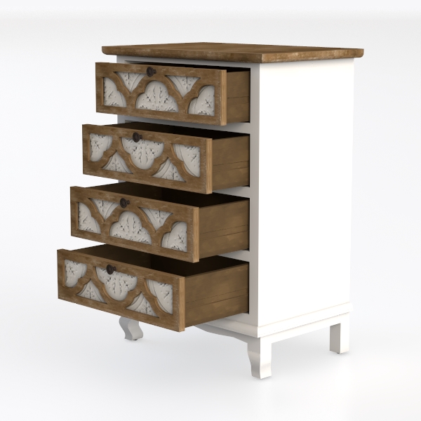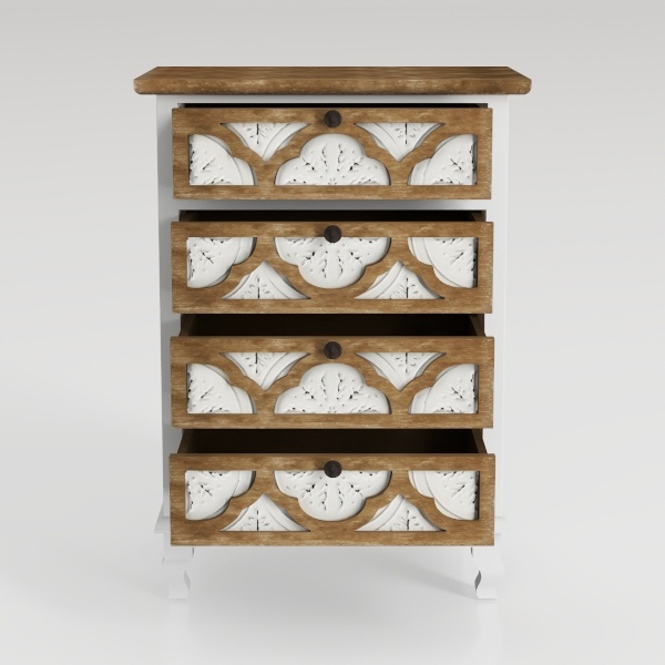 This elegant piece of furniture draws inspiration from traditional craftsmanship, blending elements of Moroccan and Mediterranean design with a soft, timeless appeal. The frame features warm, natural wood grain in a light, honeyed brown hue, evoking the warmth of sun-bleached timber, while the drawer fronts are adorned with intricate white carved patterns—delicate, floral-inspired motifs that add artisanal charm without overwhelming the eye. The contrast between the smooth, polished wood and crisp white carvings creates a visually striking balance, making it a versatile centerpiece for various spaces.