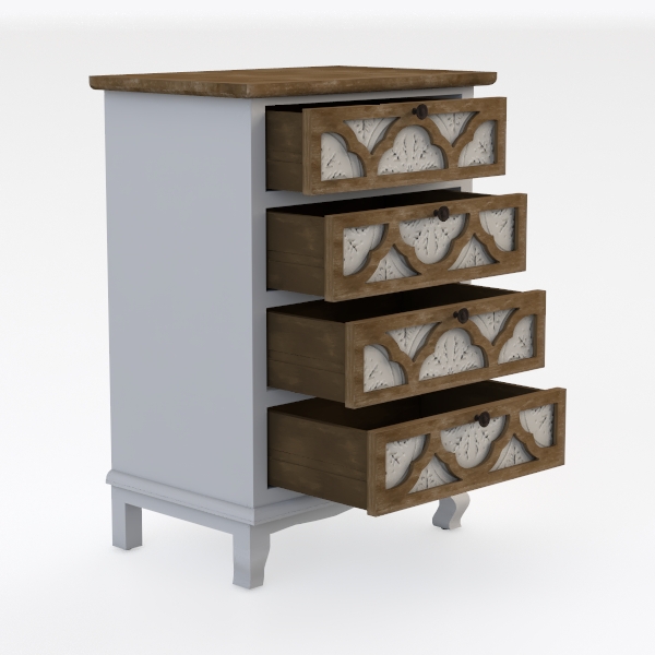 Ideal for a bedroom, it pairs beautifully with soft linen bedding and vintage brass lighting, enhancing a cozy, romantic atmosphere. In a living room, it complements both bohemian arrangements (think woven rugs and potted ferns) and minimalist setups (with sleek marble or ceramic decor), bridging different aesthetics seamlessly. The four generously sized drawers, equipped with smooth-gliding hardware, offer practical storage for linens, small essentials, or media devices, while the slender, tapered legs keep the piece light and airy, avoiding the bulk that often clings to traditional storage furniture.