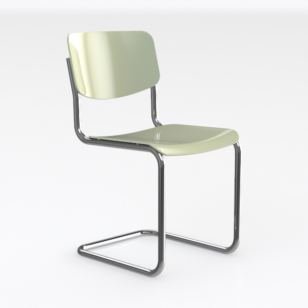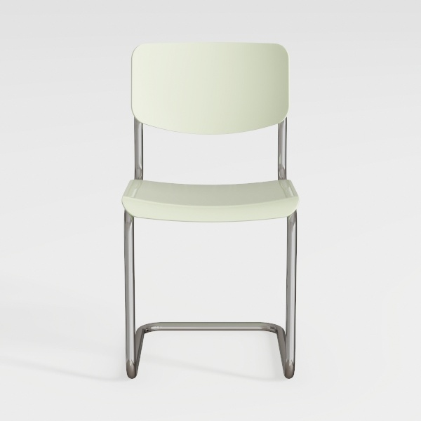 Inspired by mid-century modern minimalism, this chair blends geometric precision with soft, warm aesthetics. The seat and backrest feature a smooth, matte finish in a gentle sage tone, creating a tactile contrast with the polished chrome-plated metal legs. The light hue reflects ambient light, keeping the piece feeling airy and unobtrusive, while the streamlined profile—with its angular back and subtly curved seat—adds quiet visual depth without overwhelming the space.