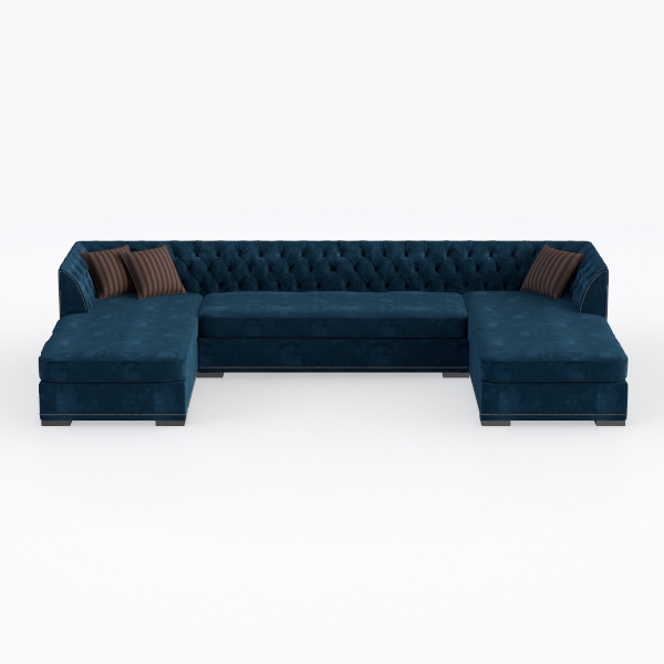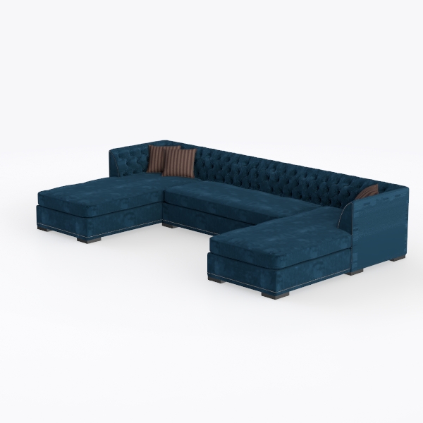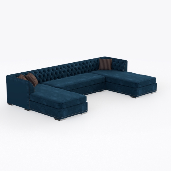 This luxurious sectional sofa draws inspiration from classic and modern design elements, seamlessly blending elegance with comfort. The deep navy upholstery, reminiscent of ocean depths, invites relaxation and creates a calming atmosphere in any living space. The tactile quality of the fabric has a soft, plush feel, ensuring an inviting touch while enhancing the visual experience with its rich color.