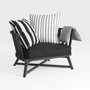 Visually, the chair makes a striking statement through its bold black-and-white contrast: the dark frame, with its angular, cross-legged base, provides a grounded, stable silhouette, while the seat and backrest maintain a sleek, unadorned profile. The three throw pillows, featuring alternating wide and narrow stripes, add dynamic visual interest—their crisp white and black patterns creating a sense of depth and rhythm that balances the chair’s solidity.