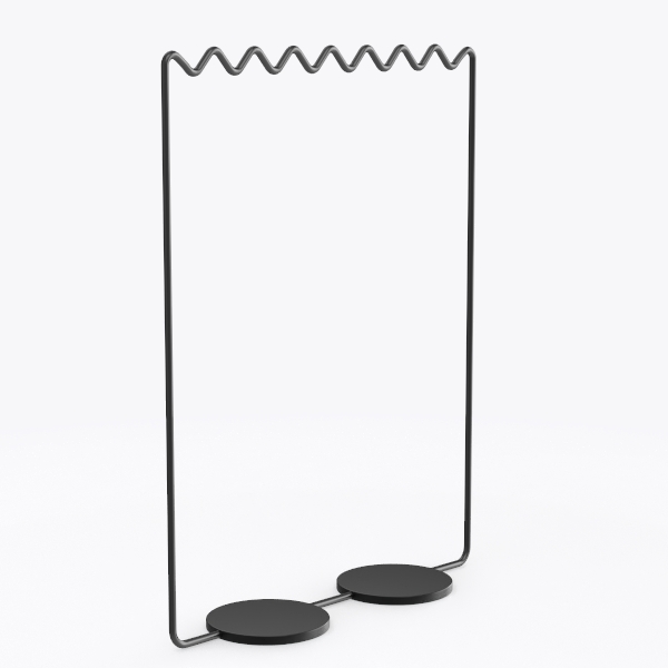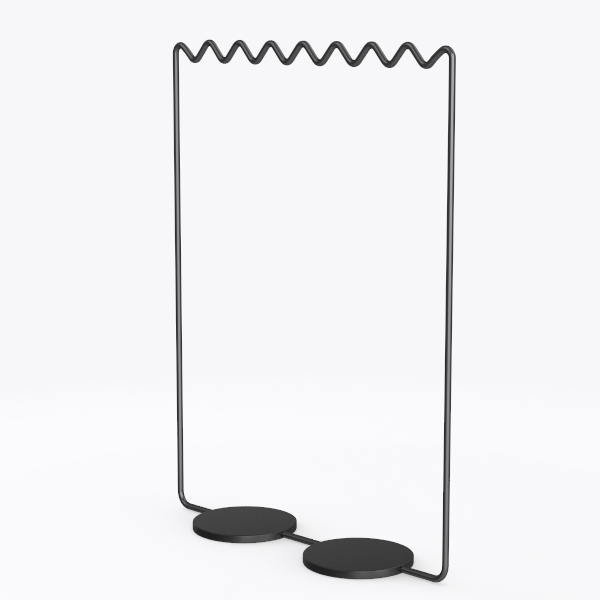 Drawing inspiration from the rhythmic curves of natural elements, this home accessory blends organic fluidity with minimalist design. Crafted from matte black metal, its frame features a sinuous, wave-like top edge that softens the otherwise angular structure, while two circular, weighted bases ensure steady support. The metal’s smooth, cool texture catches light subtly, creating a play of shadows that enhances its three-dimensional presence without overwhelming the space.
