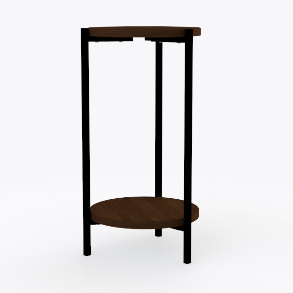 This elegant side table merges minimalist design with organic charm, inspired by the harmony of natural materials and geometric simplicity. Its two circular wooden shelves feature warm, smooth surfaces with subtle wood grain patterns, evoking a sense of earthy craftsmanship, while the slender black metal legs—polished and sturdy—provide a striking contrast, balancing the piece’s light, airy presence.