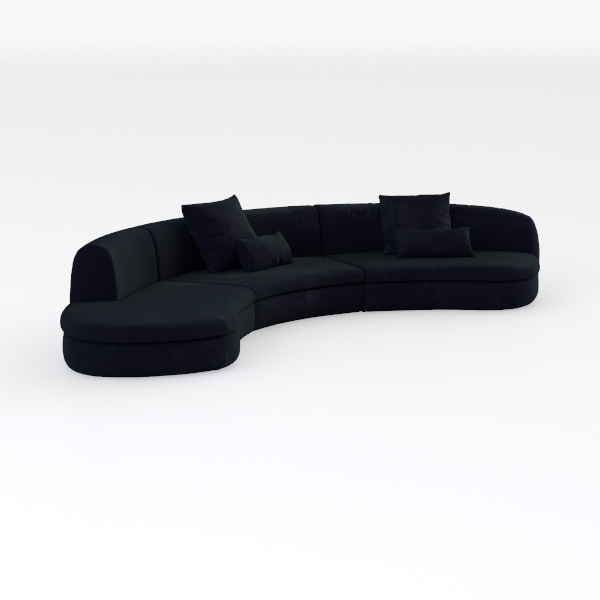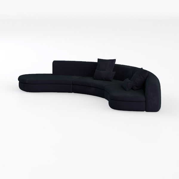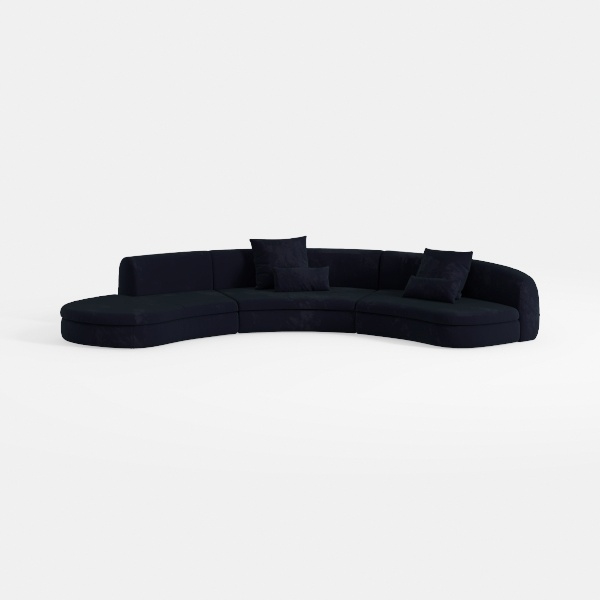 This elegant sofa draws inspiration from the fluid lines of organic architecture, its sweeping curved silhouette blending softness with modern sophistication. The sumptuous navy upholstery, with a subtle sheen that catches light gently, feels surprisingly tactile—velvety to the touch yet structured enough to maintain its shape, creating a balance of comfort and style. Visually, its deep, rich hue adds warmth and depth to a space, while the continuous curve eliminates harsh angles, making it feel both inviting and spacious.