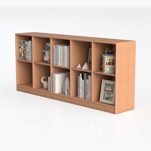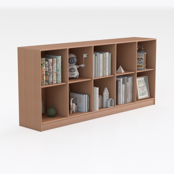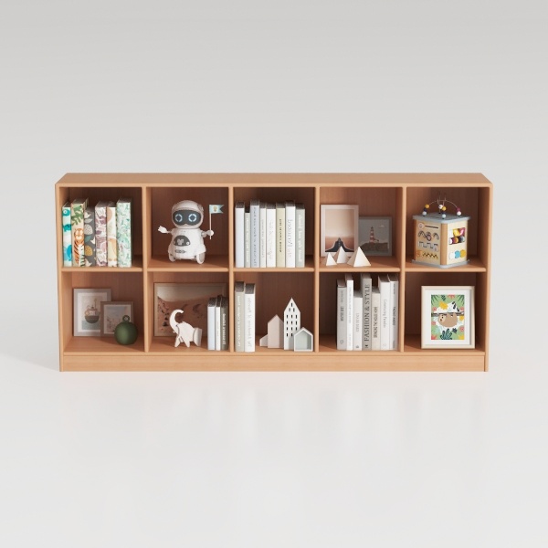 Designed to blend warm minimalism with playful charm, this storage unit features a smooth, light wood surface with natural grain, adding soft tactile warmth. Neat grid layout balances order and character, with curated books, cute figurines, and framed photos creating layered visual appeal. Ideal for a cozy living room or study, complementing Scandinavian or Japandi aesthetics, it offers organized storage for books, collectibles, and mementos, enhancing utility and ambiance.
