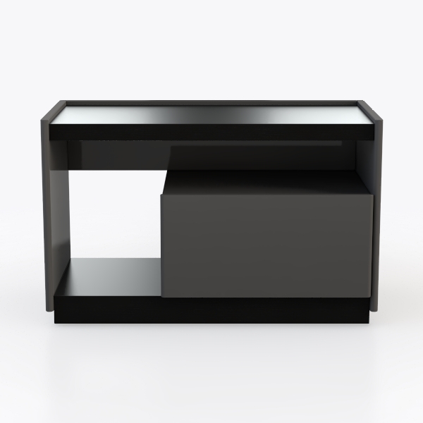 Inspired by minimalist design, this piece merges clean lines with functional space division. Its sleek black frame contrasts a smooth white top, while a matte gray storage nook adds depth—neutral tones create visual harmony, polished surfaces offer tactile coolness. Ideal for modern living rooms, pairing with geometric rugs and metallic accents, it balances style and practicality with ample surface space and a hidden storage area.