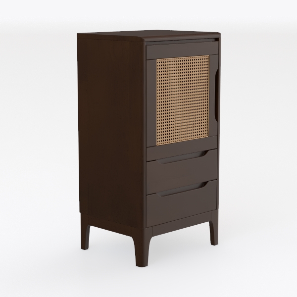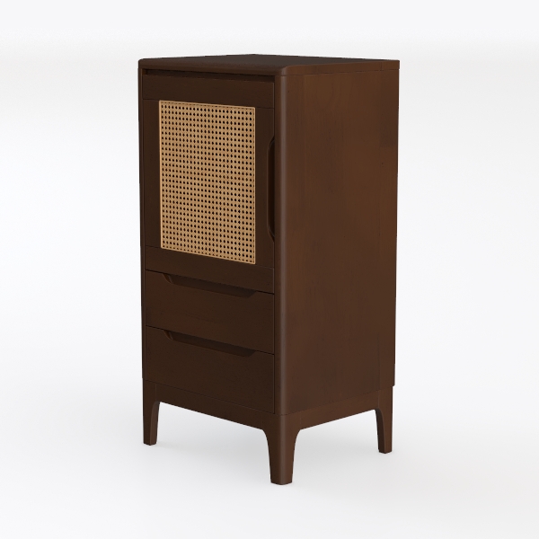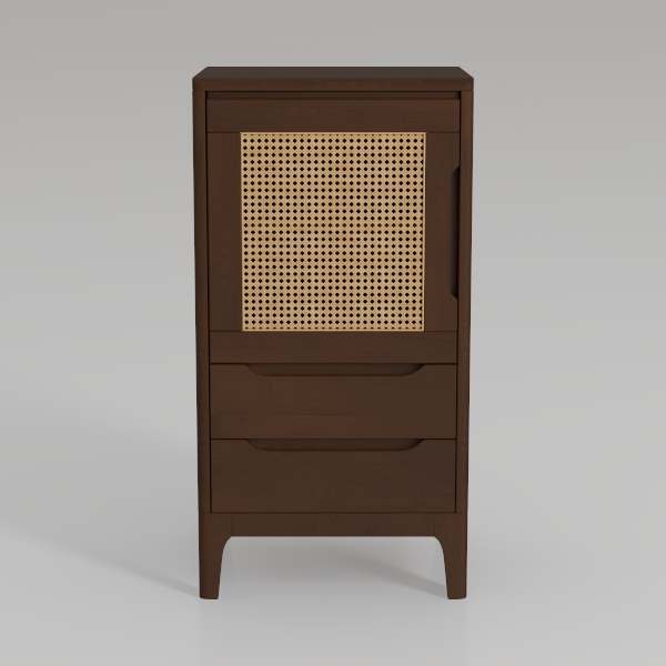 Drawing inspiration from organic natural elements, warm brown wood tones and intricate rattan detailing create a textural contrast, blending rustic warmth with delicate craftsmanship. Perfect for a cozy bedroom or minimalist living room, it pairs beautifully with linen decor and potted greenery, enhancing a serene, nature-inspired aesthetic. Two spacious drawers offer practical storage, while the slender legs add a light, airy feel to the design.