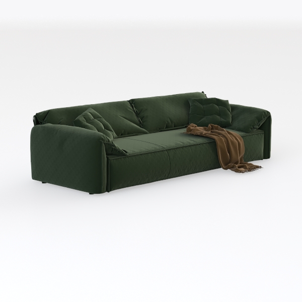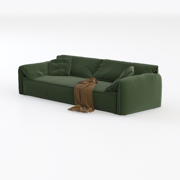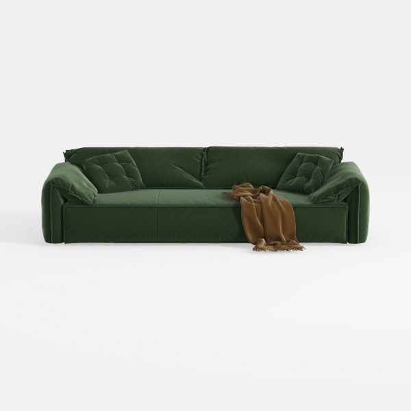 Blending organic warmth with contemporary minimalism, this sofa takes cues from nature’s soft textures and mid-century design sensibilities. Its rich forest-green hue, like the depths of a sunlit forest, evokes a sense of calm and groundedness, while the plush velvet fabric adds a tactile luxury that invites immediate comfort.