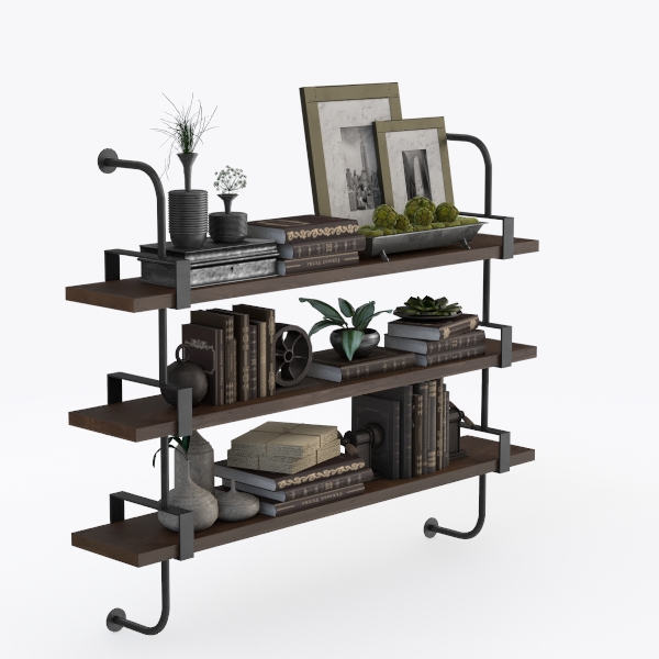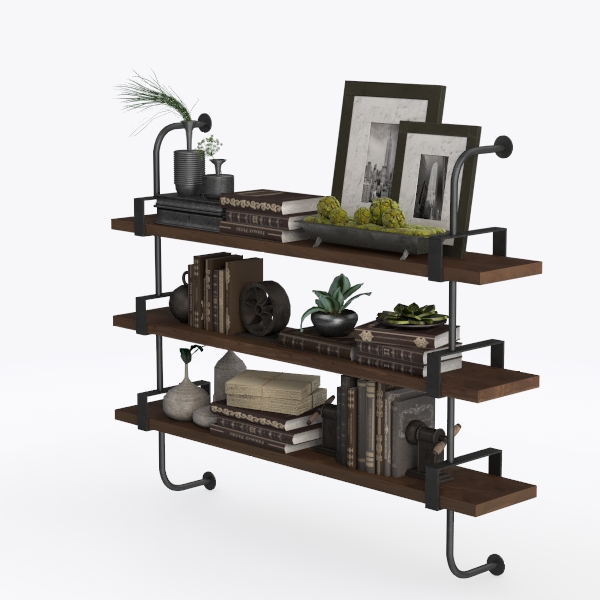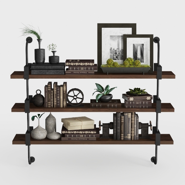 Designed by blending vintage industrial charm with natural elements, this tiered shelf features warm wooden layers and sleek black metal frames. The smooth wood and cool metal create a tactile contrast, accented by potted greenery and aged books for soft, earthy warmth. Ideal for a cozy living room or study, it pairs well with mid-century modern or rustic styles, especially marble accents and vintage lamps. Three tiers offer ample display/storage, balancing sturdiness and charm.