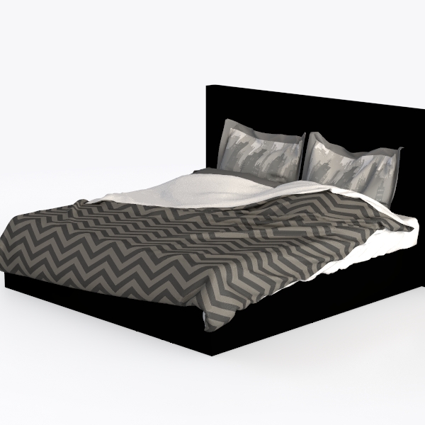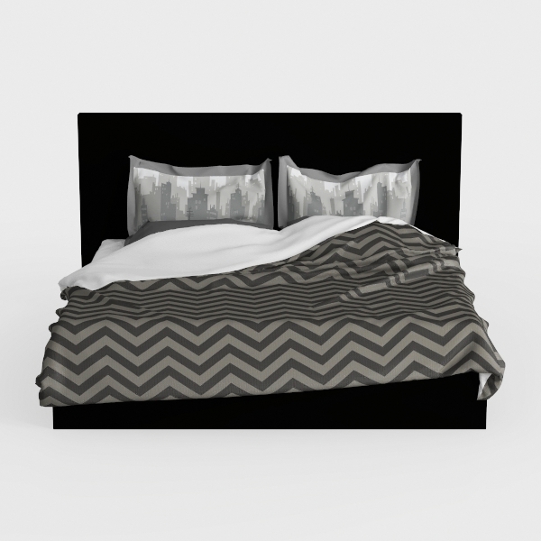 Inspired by urban nightscapes and geometric lines, this bed blends a zigzag-patterned comforter in neutral tones with city skyline pillows, adding depth and subtle character. Soft, plush fabric ensures comfort, while the sleek black headboard and white sheets create a calm, modern vibe. Perfect for a minimalist bedroom, it pairs well with wooden nightstands and metallic accents, crafting a stylish, cozy retreat.