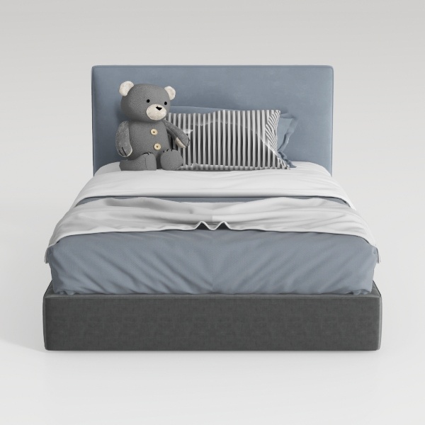 Inspired by cozy family moments, this bed features a soft, upholstered blue headboard that invites gentle touches. Crisp white linens and a textured gray base create a balanced, calming look. Ideal for a kid’s bedroom or warm minimalist retreat, pairing with wooden nightstands and fairy lights. Its sturdy base ensures stable support, making it perfect for restful sleep.