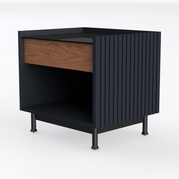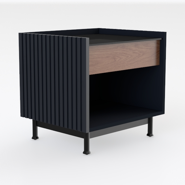 Inspired by the blend of functionality and minimalism, this nightstand draws design cues from Scandinavian aesthetics. Its warm wooden drawer front, with distinct natural grain, contrasts beautifully against the smooth matte black cabinet, creating a balanced, inviting look. The slender black legs add elegance, while the lower open shelf and smoothly gliding drawer offer ample storage, perfect for a modern bedroom paired with soft linen bedding and brass desk lamps.