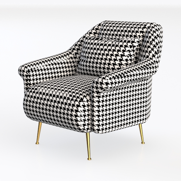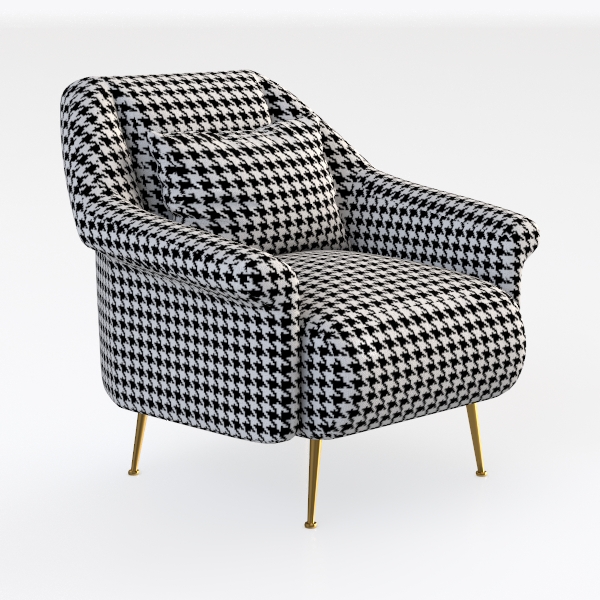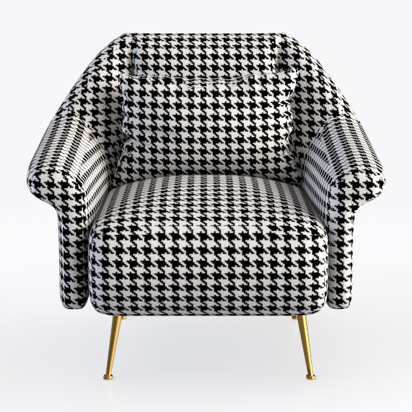 This elegant armchair embodies a harmonious blend of timeless charm and contemporary flair. Drawing inspiration from mid-century modern design, its iconic houndstooth pattern—executed in crisp black and white—pays homage to classic textile artistry while feeling fresh and relevant today. The high-quality upholstery, with its soft, slightly textured surface, invites gentle touches, promising a plush, comfortable experience. Visually striking, the bold black-and-white grid creates a striking contrast against the chair’s rounded silhouette, while the delicate, gold-finished metal legs add a touch of understated luxury, lifting the piece with a light, airy presence.