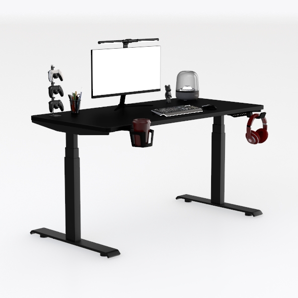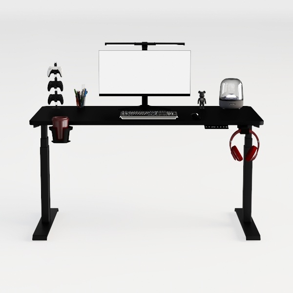 Inspired by modern work and gaming needs, this sleek black desk blends functionality with style. Its smooth surface and matte black frame exude a minimalist vibe, while integrated cup holders and headphone hooks add practicality. Perfect for a contemporary study or gaming corner, it offers ample space for monitors and accessories, ensuring a clutter-free, comfortable setup.