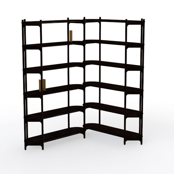 Designed with architectural precision, this shelving unit blends geometric minimalism and warm craftsmanship. Its smooth, dark wood surface with sharp, clean edges feels cool to the touch, while light and shadow interplay adds depth. Perfect for modern, industrial, or Scandinavian settings, it pairs beautifully with matte black metal legs and soft linen cushions. Staggered open shelves maximize storage for books, plants, and decor, balancing utility with a striking aesthetic.