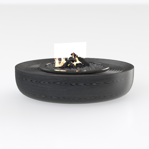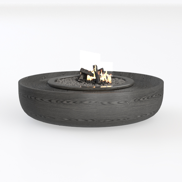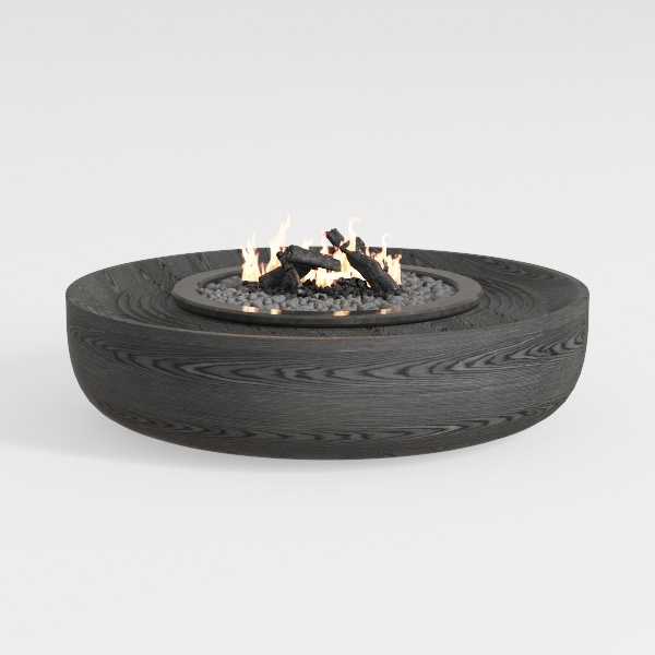 Inspired by natural campfire ambiance, its circular form and textured surface echo organic elements. The dark, carved wood grain feels smooth yet tactile, with glowing flames, black charcoal, and gray pebbles creating a warm, cozy glow. Perfect for modern outdoor spaces, it pairs with rattan furniture and wooden decks, ideal for evening gatherings, radiating warmth and light, blending utility with serene charm.