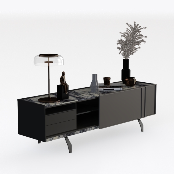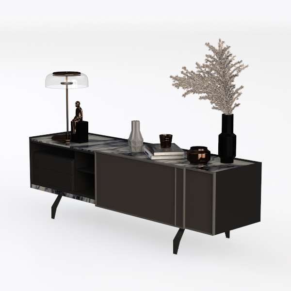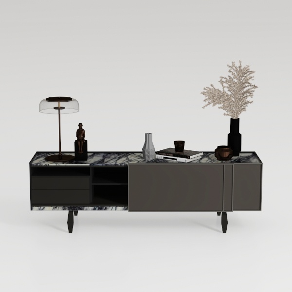 Inspired by natural stone patterns and geometric minimalism, this cabinet features a smooth marble top with striking veining, contrasting matte black cabinetry and slender black legs. The tactile blend of cool stone and warm matte surfaces exudes understated luxury, catching light softly. Ideal for a modern-luxe living room, it pairs beautifully with metallic lamps and sculptural decor. Spacious drawers and closed compartments offer hidden storage, while an open shelf adds display space for curated books and vases.