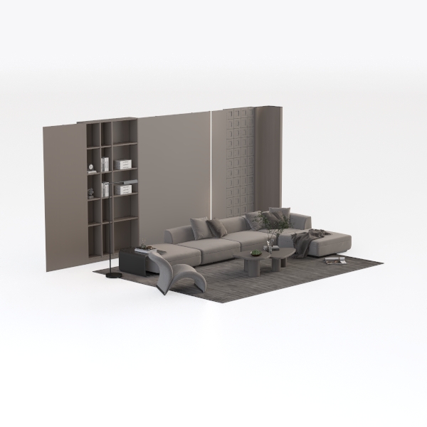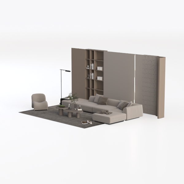 Inspired by organic minimalism, this living space blends soft textured fabrics and warm wood tones, creating a serene, spacious vibe with layered textures. Ideal for modern minimalist living rooms, pairing beautifully with marble accents and metallic fixtures, it features spacious seating with deep cushions for ultimate comfort and integrated modular design to maximize space efficiency.