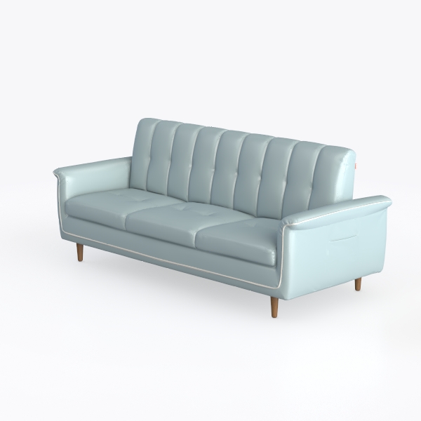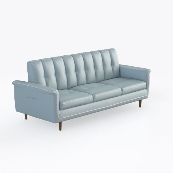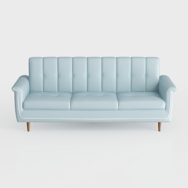 Drawing from mid-century modern minimalism and contemporary comfort, this sofa blends sleek lines with soft aesthetics. Crafted with a smooth, slightly textured sky-blue upholstery, it feels inviting—cool yet warm, with subtle give that cradles the body. Vertical channel tufting along the back and seat adds depth, while crisp white topstitching along armrests and edges creates a fresh contrast, making the light color pop against neutrals. Slender, tapered oak legs keep it lightweight, lifting gently off the floor to brighten the space.