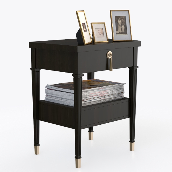 Inspired by classic furniture lines, blending timeless elegance with modern minimalism, this side table features dark wood with subtle grain. Gold metal accents—from the drawer pull to tapered legs—add crisp contrast, creating a warm, layered visual texture. Ideal for modern-luxe living rooms or bedrooms, it pairs beautifully with marble coffee tables and brass floor lamps, enhancing space sophistication. The lower shelf neatly holds magazines, and the functional drawer with a gold pull offers hidden storage for remotes or reading glasses, balancing style and utility.