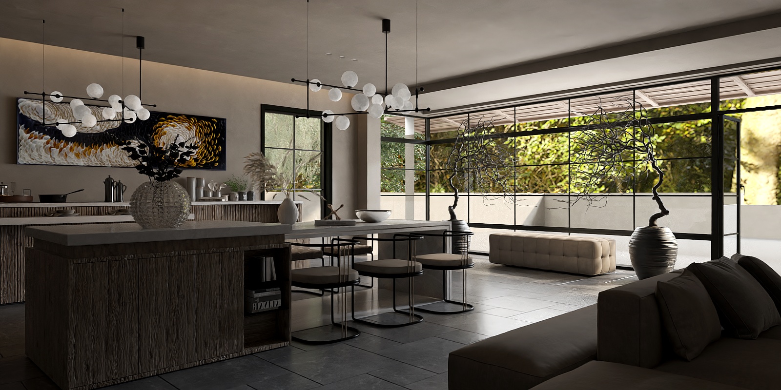 Inspired by the blend of natural materials and modern minimalism, this piece features sleek marble-like tops and warm wooden textures, creating a serene, sophisticated look with clean lines and neutral tones. Ideal for modern kitchens or dining areas, it pairs beautifully with matte black metal accents and soft upholstered bar stools. The spacious countertop offers ample workspace, while integrated storage ensures practicality, balancing style and functionality seamlessly.