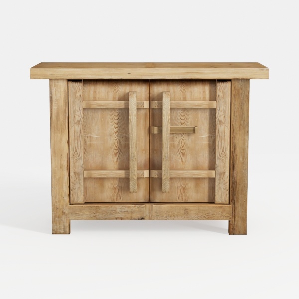 Crafted from solid wood, its design draws inspiration from natural craftsmanship, highlighting raw, unpolished beauty. The warm oak finish reveals distinct wood grain, offering a smooth yet subtly rugged tactile experience. Clean lines and a low-profile silhouette blend serenely into minimalist spaces, ideal for dining or living rooms. Pair with linen textiles and ceramic vases, and its double doors reveal adjustable shelves for practical storage of tableware or decor.