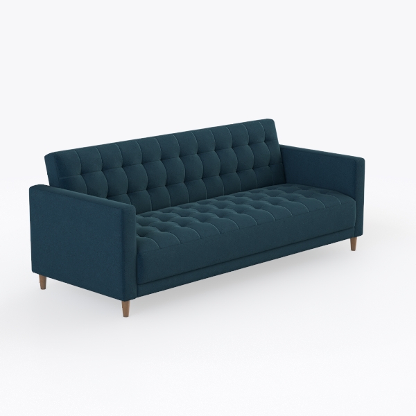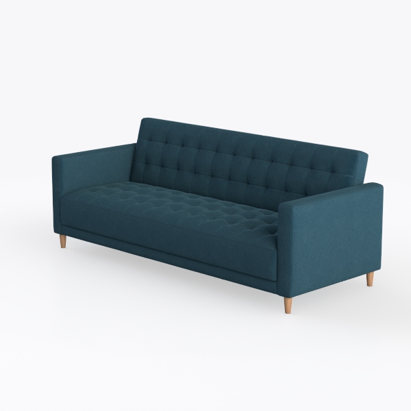 Rooted in a blend of mid-century modern simplicity and organic warmth, this sofa draws inspiration from the serene beauty of coastal environments, with its rich teal hue evoking the calm, deep tones of ocean waters. Its soft, velvety texture is immediately inviting—plush to the touch, yet structured enough to maintain a polished silhouette. The tufted square pattern on the backrest and seat adds elegant dimension, while the clean, straight lines of the arms and base keep the design streamlined and contemporary, avoiding clutter.