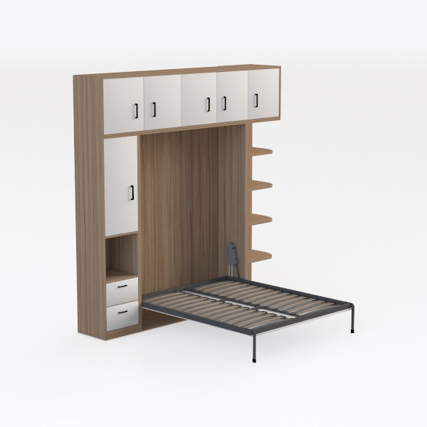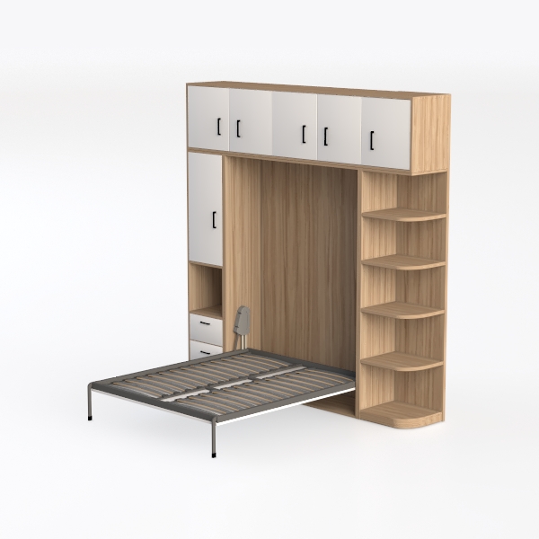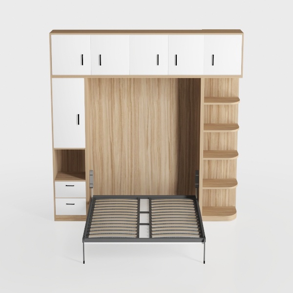 Designed for compact spaces, blending sleek storage with functional sleep, this piece features warm oak wood grains contrasting with crisp white cabinet fronts. Its smooth, tactile surfaces and clean lines create an airy look, ideal for modern minimalist or Scandinavian bedrooms. The hidden bed mechanism frees floor space, while integrated drawers and shelves offer ample storage for linens and essentials, pairing perfectly with linen textiles and geometric rugs.