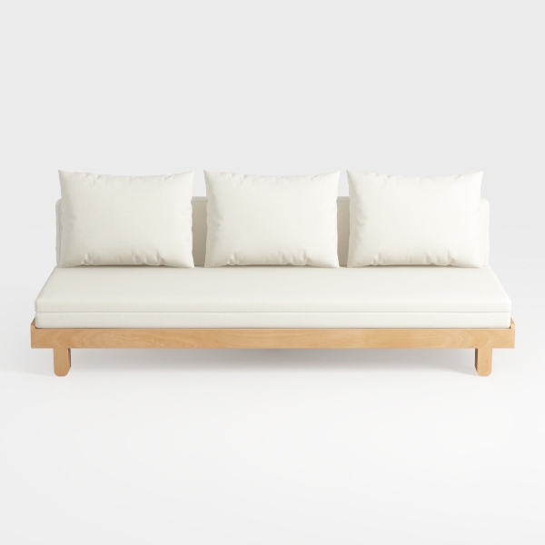 Designed with Scandinavian minimalism in mind, this sofa draws inspiration from the quiet harmony of natural light and uncluttered spaces, blending softness with clean, intentional lines. The upholstery, a warm off-white with a subtle, breathable texture, feels gentle to the touch—light yet substantial, like a well-loved linen shirt. Three generously filled cushions, plump and slightly textured, invite relaxation, their edges softening the sofa’s structured silhouette. The light oak frame, with its smooth, sanded finish, adds a warm, organic contrast; its thin, tapered legs lift the piece, creating an airy, almost weightless presence that enhances the room’s sense of openness.
