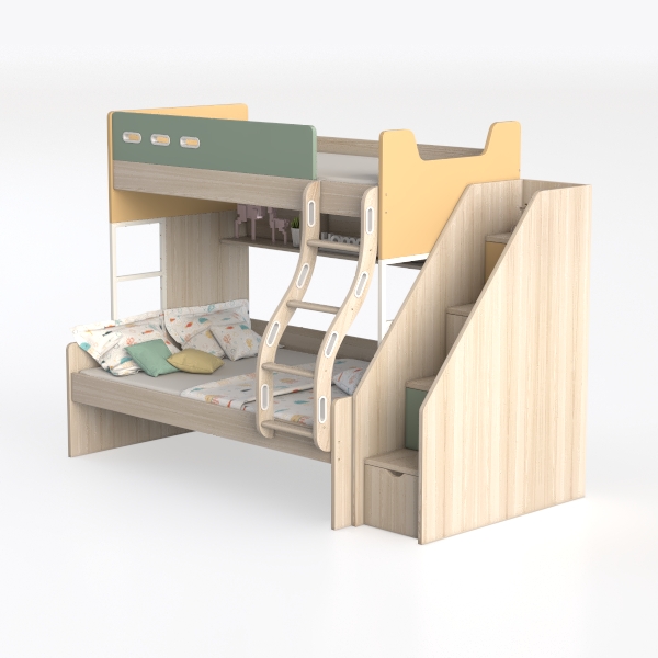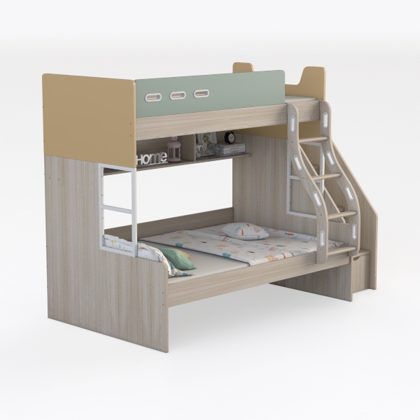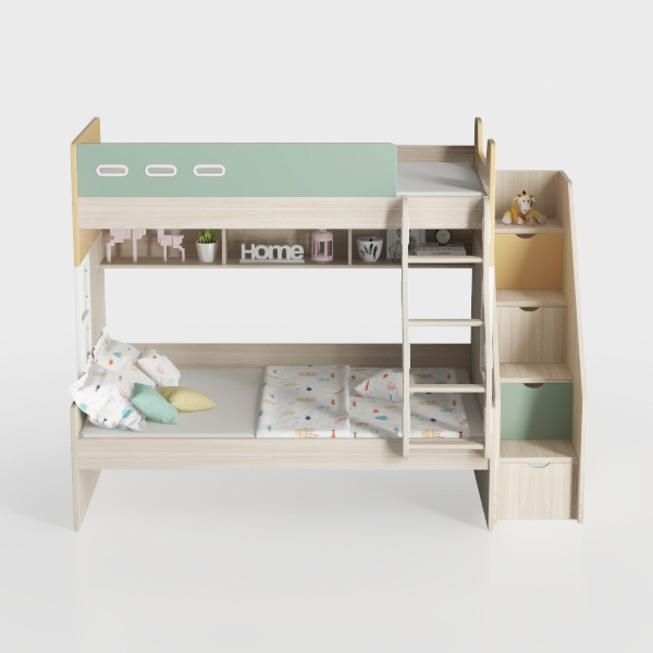 Designed to blend functionality and warmth, it draws inspiration from cozy, space-efficient havens for kids or shared family rooms. Soft wood grains, mint-green accents, and crisp whites create a fresh, inviting vibe—warm to the touch, with clean lines and playful touches like potted plants and a "Home" label. Ideal for a kid’s bedroom or minimalist family space, it pairs with pastels and natural light. Dual-level design saves space; the ladder with built-in drawers offers storage, while open shelves keep small items handy.