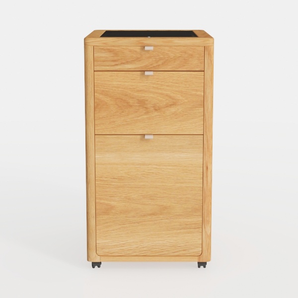 Inspired by natural warmth and minimalist Scandinavian design, this wooden cabinet features a smooth oak surface with visible wood grain, warm golden undertones, and a soft, tactile feel that enhances a cozy, organic atmosphere. Ideal for a modern home office or bedroom, it pairs seamlessly with sleek desks and linen sofas, blending practicality with understated elegance. Spacious compartments and smooth-rolling casters allow easy mobility, balancing ample storage with space-saving design, making it a versatile addition to any clutter-free living area.