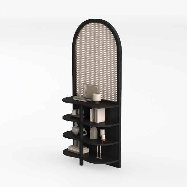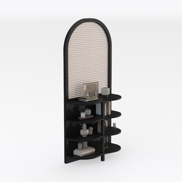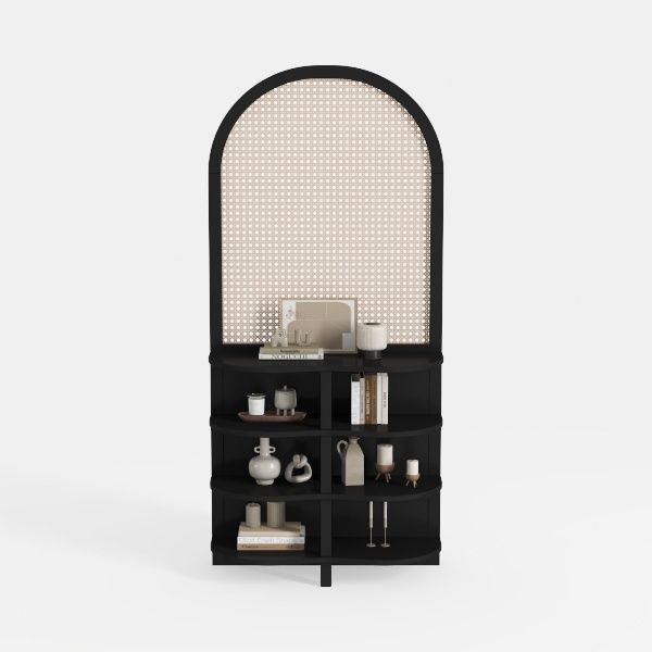 Blending classic arch motifs with modern minimalism, this black shelving unit features a smooth matte frame and textured perforated top. Its curved silhouette softens the space, while layered shelves display curated decor—books, ceramic vases, and metallic accents. Ideal for a contemporary living room or study, pairing beautifully with warm woods and sleek metals, it balances style and practicality with ample storage.