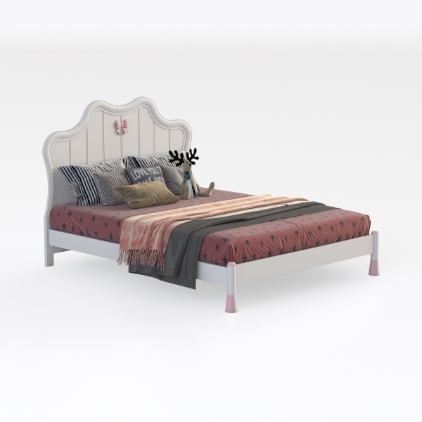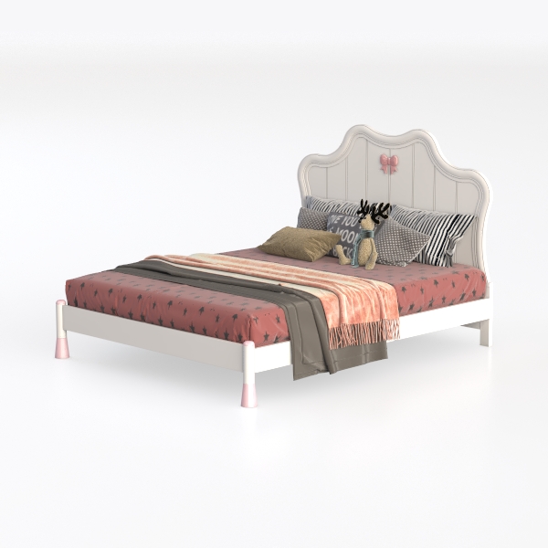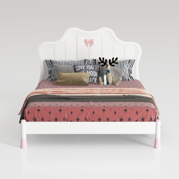Inspired by fairy tales, the headboard has a soft curved silhouette with a delicate pink bow, evoking a magical, playful vibe. Smooth, creamy-white surfaces feel cool and gentle to the touch, while the dark star-patterned bedspread adds a sweet contrast, balancing light and soft tones. Perfect for a princess-themed kids' room, pair with fluffy pillows, a pastel rug, and warm fairy lights to enhance its whimsical charm. Sturdy pink legs ensure stability, and ample headspace offers cozy support for bedtime stories or playful naps.