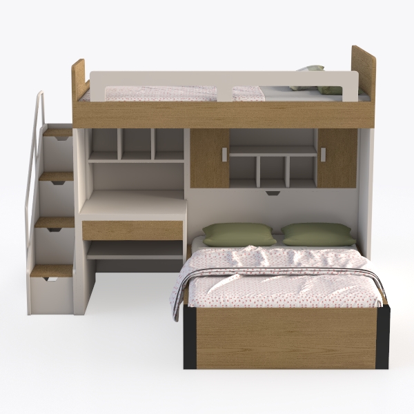 Inspired by space-saving solutions for family living, this dual-level bed blends warm wooden textures with clean white accents, creating a cozy yet modern vibe. Ideal for a kid’s room or teen space, it features a lower bed with under-bed storage, an upper bunk, and an integrated desk with shelves, ensuring comfort and versatility in limited areas.