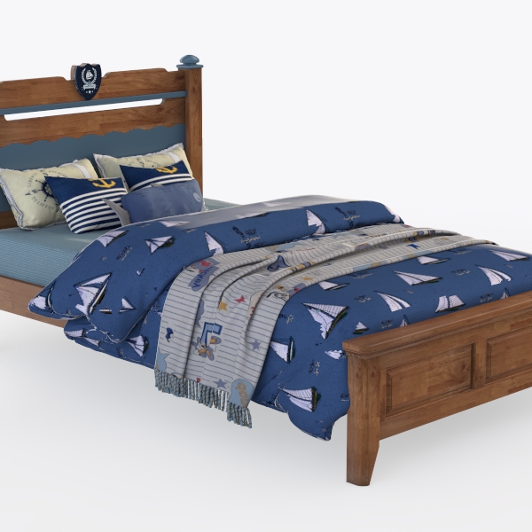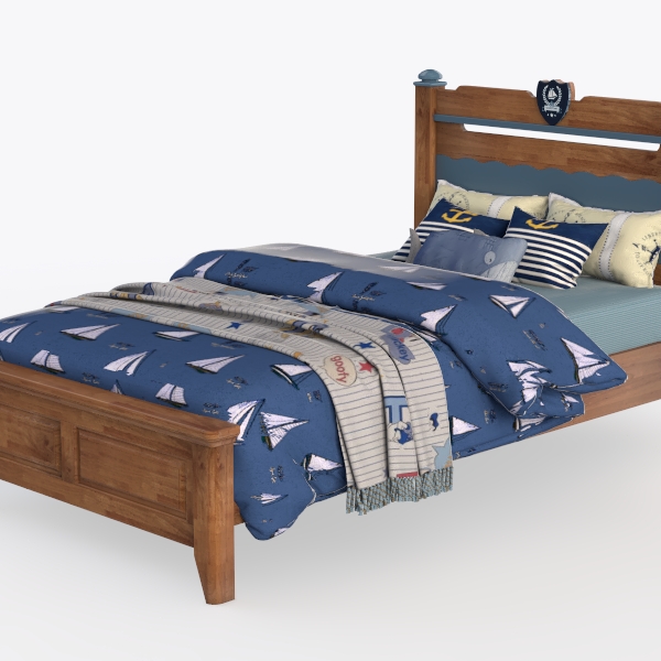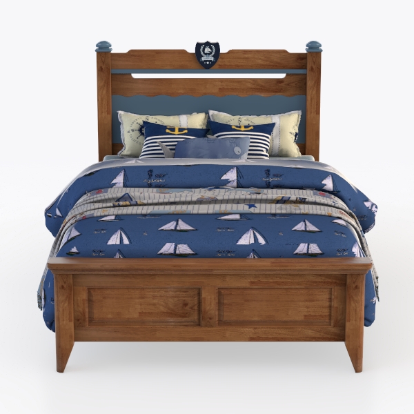 Inspired by ocean adventures, this bed blends warm wooden tones, a blue headboard, and a vintage badge, radiating nautical charm. Its smooth wooden frame and soft sailboat-patterned bedding create a cozy feel, with striped/anchor pillows adding playful detail. The blue-and-white palette evokes a fresh coastal vibe, ideal for a whimsical kids' room or serene retreat. A sturdy wooden bench at the foot offers storage/seating, balancing style and practicality.