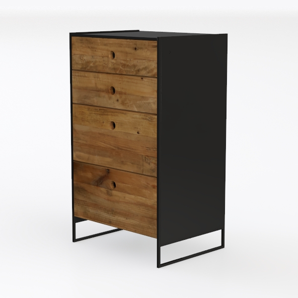 Blending organic warmth with industrial edge, this cabinet features natural wood grains—smooth, tactile, and rich with rustic texture—paired with striking black metal trims and angular legs. Clean lines and balanced proportions create a minimalist yet inviting look, ideal for modern industrial or Scandinavian living rooms, complementing marble accents and warm decor. Four roomy drawers offer ample storage, with circular pull handles adding subtle, functional charm.