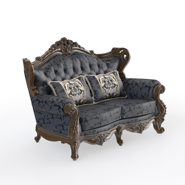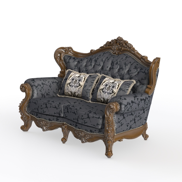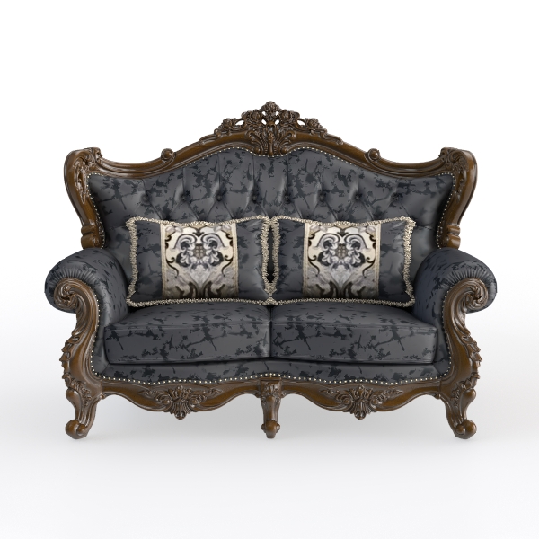 This sofa captures the timeless elegance of classical design, inspired by the elaborate craftsmanship of 18th-century European aristocratic interiors. Its frame, crafted from rich, dark wood, features intricate, symmetrical carvings—delicate scrolls and floral motifs that add depth and artistry, with a smooth, polished finish that feels warm and substantial to the touch. The upholstery, a sumptuous fabric with an understated dark pattern, offers a soft, velvety texture, while two tastefully styled throw pillows with ornate silver trim introduce subtle contrast, enhancing the sense of refined luxury. Visually, the interplay of the deep, muted fabric and the warm wood frame creates a harmonious balance, making it a striking focal point in any room.
